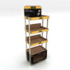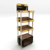 The bottom tier includes a closed storage compartment, providing additional space for inventory or promotional materials.